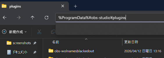 obs-wolnamesblackedoutフォルダを%ProgramData%\obs-studio\plugins\にコピーします。