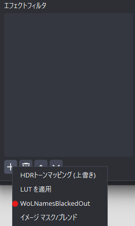 - OBSでゲームキャプチャにエフェクトフィルタ”WoLNamesBlackedOut”を追加して利用します。